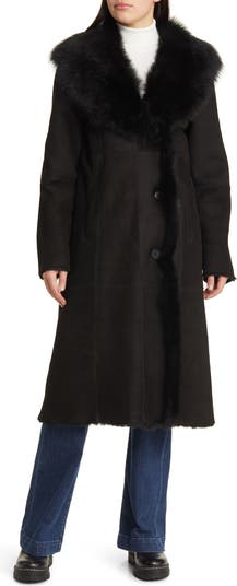 Luxuriously plush lambskin shearling lends warmth to a longline coat framed by a sumptuous shawl collar and neatly shut with tonal buttons.