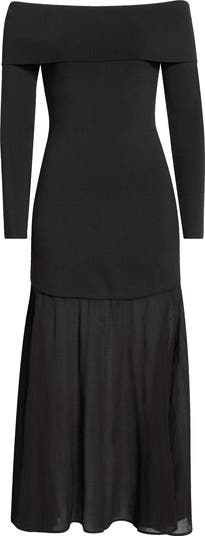 A soft rib and pleated semisheer fabric come together elegantly on this mixed-media dress fashioned in an off-the-shoulder silhouette.