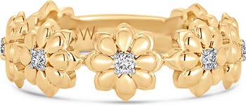 Shine blossoms along this 18-karat-gold ring stationed with diamond-centered daisies.