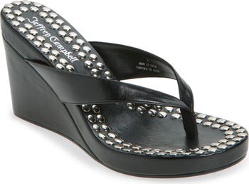 Rows of glossy studs trim the footbed and bring an edgy aesthetic to a lofty faux-leather flip-flop set on a subtle platform and chunky wedge heel.