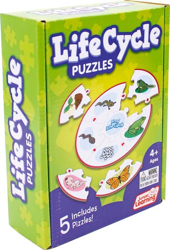 - Each puzzle has a unique die cut to follow the life cycle sequence and be self-correcting.