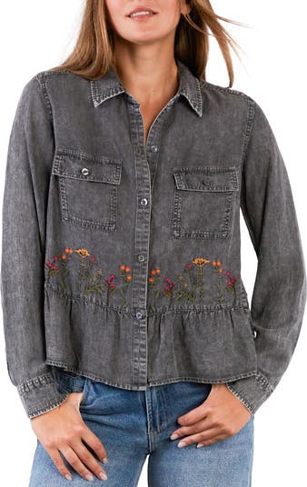 Embroidered wildflowers sprout all around a washed lyocell shirt that's finished with a peplum for a flowy untucked look.