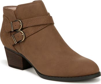Buckled straps crisscross over the instep of a mixed-media bootie balanced by a plain toe and stacked block heel.
