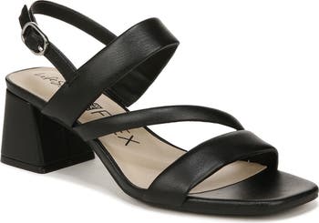 Asymmetric vamp straps lend modern dimension to a stylish slingback sandal grounded by a cushioned footbed and flared block heel.