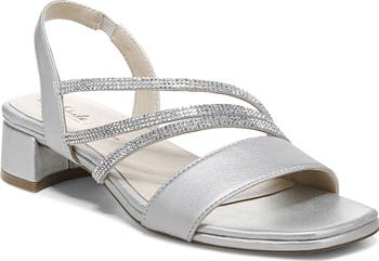 Asymmetric straps add of-the-moment glamour to a block-heel sandal that's supportive, well-cushioned and flexible.