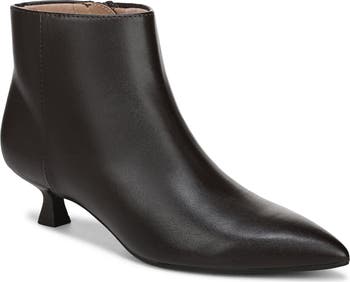 A pointy toe and flared kitten heel balance a streamlined ankle bootie fashioned with a side zipper for easy entry.