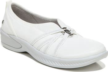 Glinting hardware crowns the top of this shock-absorbing slip-on shoe accented with shimmering stitching on the straps.