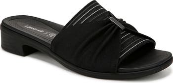 A striped, metallic strap adorned with a ruched bow accent charms this sleek slide that adds a stylish touch to warm-weather looks. The brand's Air Step Technology offers a weightless feel so you move gracefully with every step.