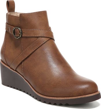 A grippy wedge heel lifts a faux-leather bootie highlighted by crisscross straps with a decorative buckle. A Soft System® comfort package provides all-day support, flex and cushioning, while a traction sole adds extra stability.