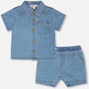 Easygoing charm meets classic style in this chambray top and short set in light blue. The short-sleeved shirt features a button-down front, a chest pocket, and a relaxed fit, paired with matching elastic-waist shorts for all-day comfort. Made from a soft cotton blend, this versatile outfit is perfect for warm-weather outings and playful adventures.