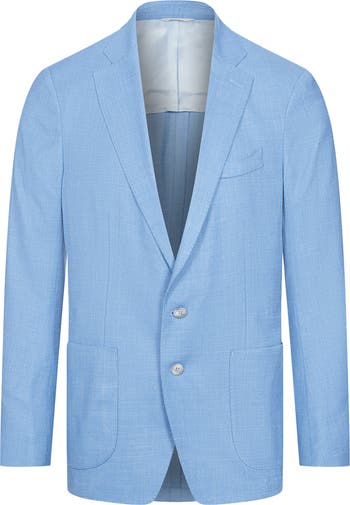 A subtly textured blend of wool, silk and linen in a pale blue relaxes the formality of a sport coat designed with rounded shoulders emphasizing its unconstructed tailoring. Lightweight and partially lined, it pairs well with relaxed silhouettes and easily complements your favorite elevated and warm-weather looks.