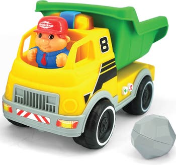 LIGHT & SOUND: DUMP TRUCK - Motorized dump truck goes forward with auto-stop action! With realistic engine revs and horn for added fun! Includes a removable driver to encourage hours of creative play. Easy Operation: Designed for young children, the dump truck is easy to operate with simple button controls, allowing even the youngest construction enthusiasts to enjoy playing with it. Durable Construction: Made from sturdy materials, the dump truck is built to withstand rough play and ensure long-lasting durability, making it suitable for indoor and outdoor use. The "Light 'N' Sound: Dump Truck" offers a dynamic and engaging play experience that stimulates children's creativity and provides hours of construction-themed fun. Whether they're loading, hauling, or unloading, young builders will delight in the realistic features and endless possibilities for imaginative play.