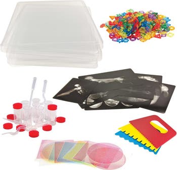 3 years & up. This Light Table Activity Kit is the perfect starter kit for younger students! The kit features tons of safe and colorful materials to play with on a light table. Count and sort beautiful bead shapes, examine details in x-rays, layer optical illusion sheets to discover interesting patterns, drop paint onto the washable surface, and drag paint scrapers on top to make swirls and lines. Includes: 5 clear plastic trays, counting and stringing rings, 12 optical illusion sheets, 2 paint pipettes, 2 squiggle pipettes, 8 clear vials, 3 paint scrappers, 8 animal x-rays, and a teacher guide.