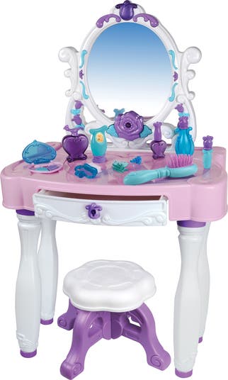 The Light Up Princess Vanity Table is a perfect gift for beauty make believe! It includes a Light-up Mirror, Vanity Table, Stool and many beauty accessories. A total of 12 pieces including: Perfume Bottle, Play Lipstick, Nail Polish, Nail Brush, Lotion, Eye Shadow Compact, Hand Cream, Hair Brush, Hair Clip and Ring. Assembled size: L 18.5" x W 12.5" x H 31".