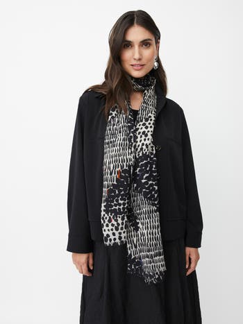 Complete your outfit with this stylish scarf boasting a hand-painted print in monochrome shades. Made of 100% wool with short fringes at the ends, it ensures you stay warm with style.