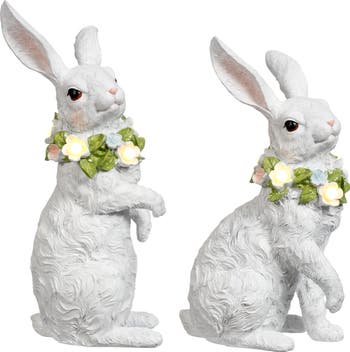 The Mark Roberts Lighted Bunny with Wreaths set includes two charming resin figures, each measuring approximately 13–15 inches tall. Beautifully crafted with festive details, the bunnies hold decorative wreaths and feature soft lighting that adds a warm seasonal glow. Perfect for spring or Easter décor, this elegant set brings a whimsical yet refined touch to any display.