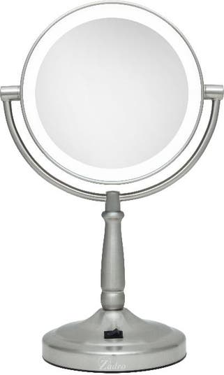 Make your beauty routine a luxurious experience with this lighted makeup mirror. Its 9-inch width x 5.5-inch depth x 14-inch height provides the perfect backdrop for quick and easy touch-ups. Enjoy the convenience of its 7-inch rotating swivel head, which rotates 360 degrees, and its dual-sided 5X and 1X magnifications. Its LED ring light, with a cool white light color temperature, is sure to bring out the best in your reflection. Its cordless feature enables you to take it anywhere, and its brushed satin nickel finish makes it an elegant addition to any room.