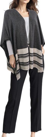 Cashmere shawl ruana shaped, body in all over plain jersey with multi stripes pattern at bottom edges.