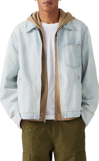 A beloved workwear jacket is reinterpreted in lightweight, light-wash denim with a relaxed fit and a zip closure for easy layering.