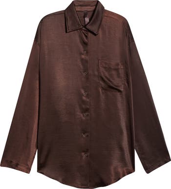 Draped in satin and designed in SKIMS signature smooth, elevated fabric, this oversized button-up shirt features a slight high-low hem and chest patch pocket.