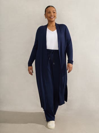 This Navy Lightweight Supersoft Maxi Cardigan is a wardrobe staple and one that is so comofrtable you'll want to wear it time and time again. It has an open front silhouette making it create beautiful movement and the long sleeves give you all the coverage you want. The supersoft fabric it is cut from is the comfiest thing and feel so soft against you. Style with out matching Navy Supersoft Pants and one of our slubs for the ultimate look.
