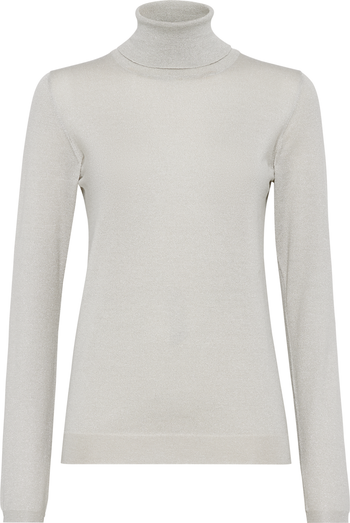 Cashmere and silk fibers are manufactured together with a fine lamé thread to enrich the texture with delicate metallic reflections. The presence of a synthetic fiber provides added comfort.