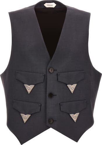 This runway-featured vest is all about detail work, from the mohair-enriched wool that gives the body a refined texture to the crisp, masterful construction. Western-inspired metal tips at the front bring a sharp glint that feels intentional, not costume. The Medusa-head hardware at the nape adds the label’s signature note.
