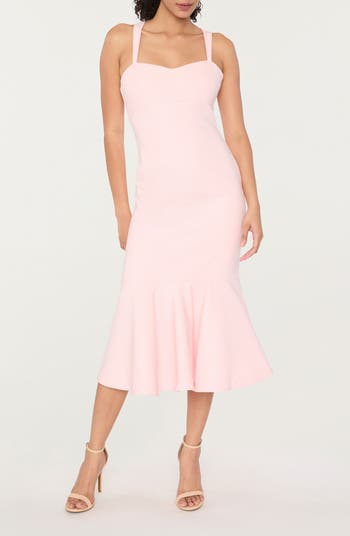 A flouncy hem gives swingy movement to this figure-skimming dress made with a strappy skin-showing back.