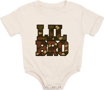 The Lil Bro Camo Patch Short Sleeve Romper is a great way to celebrate a new little man who has joined the family!