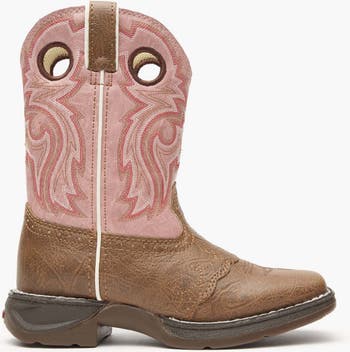 These Lil' Durango girl's Western boots are pretty and practical. The pink cowboy boot and tan hues play off one another perfectly, while the decorative stitching, scalloped edging, and saddle vamp add charm and authentic Western flair. These are the perfect children's Western boots!The upper is made from durable faux leather, allowing your child to enjoy the classic Western look with a material that handles all kinds of weather and is easy to clean. Pull straps and pull holes make it simple for kids to slide these boots on and off without assistance.Inside, the mesh lining is lightweight, breathable, and soft - helping prevent discomfort or chafing. A cushion flex insole adds lasting comfort and just the right amount of flexibility for growing feet.The bottom of the boot features a durable rubber outsole that provides excellent grip and flexibility. A steel shank offers solid arch support and enhances stability, while the rolled shank area ensures stirrup-friendly wear. These boots are finished with a 1 cowboy heel and a double row sole stitch for added durability and Western style.They're just adorable, they're built to last, and they fit comfortably... What are you waiting for? Get your little girl a pair of these Lil' Durango Little Kid Tan Lacey Western Boots today!