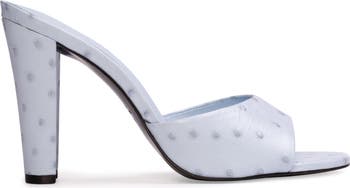Round toe slip on mule, set on a sleek structured block heel. Made with ostrich leather.