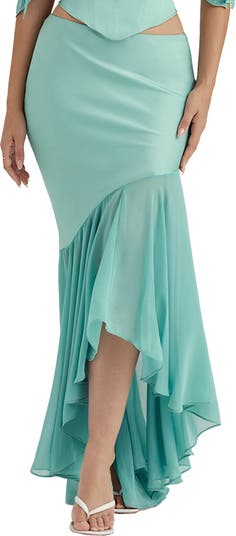 This stretch-satin skirt with a flowing chiffon ruffle sways with every step you take.