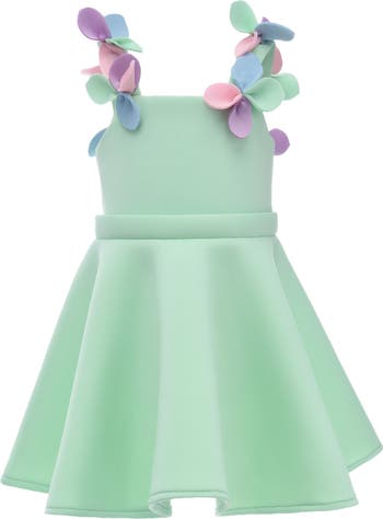 Enter a world of pastel enchantment with the Lila Blossom Dress. This delightful design is adorned with clusters of soft, multi-colored petals blooming from the straps, creating a garden of whimsy as unique as your little one. Coupled with its gentle A-line shape and soothing mint green hue, this dress is a poetic selection for any day poised for delight.