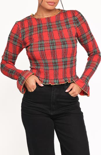 Tartan checks add festive vibes to this cropped ruffle-cuff top made with sweet smocking for a shapely silhouette.