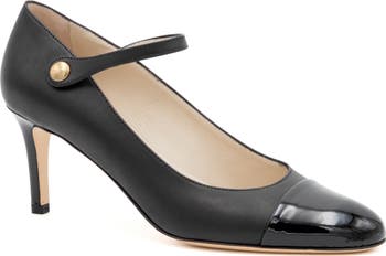A glossy cap toe and svelte heel being poised balance to an Italian leather pump secured by a slender strap at the ankle. A foam-cushioned footbed with built-in arch support delivers optimal comfort.