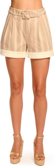 Contrast cuffs and a coordinating belt provide preppy finishing touches for these crisply striped high-waist shorts.