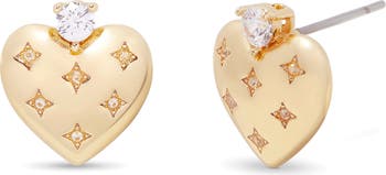 Dainty cubic zirconia nestle into burst-shaped settings on these heart stud earrings crowned with even more sparkle.
