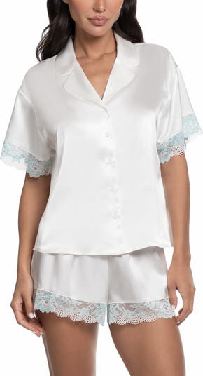 Perfect for lazy mornings and long evenings, these satin pajamas are adorned with contrasting lace trim.