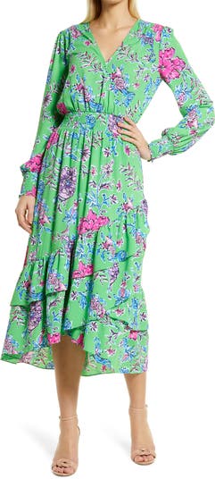 A bright floral print brings signature Lilly Pulitzer energy to a long-sleeve midi dress with a surplice bodice, smocked waist and twirly tiered skirt.