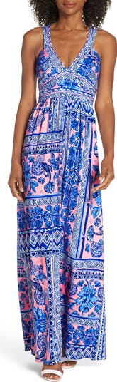Get in the vacation mindset with this easy, vibrantly patterned maxi that uses soft gathers to flatter your curves and whittle the waist.
