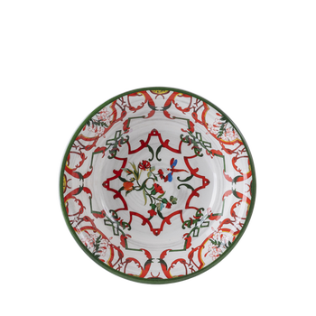 Durable melamine dinnerware for indoor/outdoor use decorated with greens, reds and pops of blues, yellows and oranges.