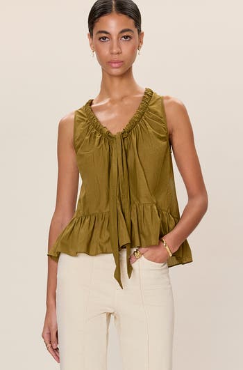 Crafted from a luxurious cotton–silk blend, the Lilou Tank offers an effortless expression of soft femininity. The romantic tie-front neckline is framed by delicate gathers that skim the body with graceful ease. Unlined for a light, fluid drape, this sleeveless silhouette brings a polished yet relaxed elegance to warm-weather dressing.