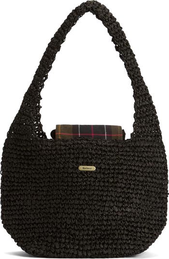 A British take on beachy style, this crocheted-raffia shoulder tote comes with a cotton-twill lining and a tartan-wrapped drawcord closure.