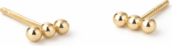Three gold balls. The simplest thing you'll put on today and the one you'll get complimented on. The Lily sits close to the lobe with a row of high-polish spheres that catch light without demanding attention. Wear them alone, stack them with hoops, tuck them into a second or third piercing. They pull any ear look together effortlessly. 14k gold fill. Three-ball stud. 10mm. Butterfly backs. Sold as a pair.
