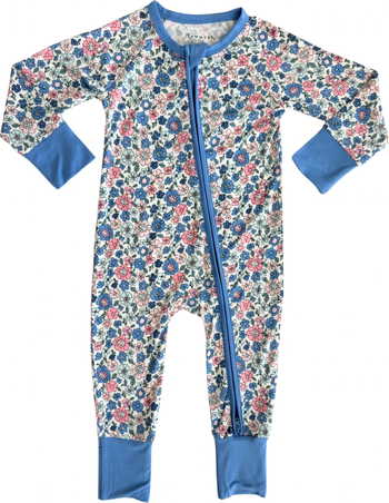 Lily Floral Zipper Romper – Bold Blooms, Everyday Ease. Let your little one bloom in comfort with our Lily Floral, featuring a vintage-inspired floral print in dreamy shades of blue, blush, and soft ivory. This botanical beauty is made for sweet snuggles and stylish snoozes, with a vibrant periwinkle trim that adds the perfect pop of color.