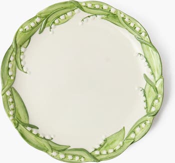This charming Dinner Plate comes with our unique hand-painted Lily Of The Valley design.Pretty and versatile in gentle green tones, this ceramic plate comes as a set with our matching Lily Of The Valley Starter Plate, Green Ikat Tablecloth, and Serena Green Applique Placemats.Care Instructions: Dishwasher Safe.