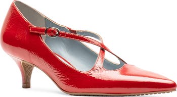 Crisscrossing straps and a notched topline form a heart-shaped cutout on a Brazilian leather pump charmingly framed by a pointy toe and tapered kitten heel.