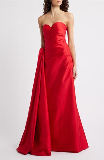 A boldly flared skirt sweeps the floor as you twirl the night away in this strapless taffeta ballgown.