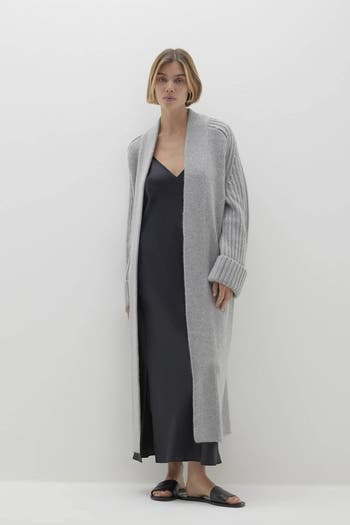 The Lilyan Longline Cashmere Cardigan is an effortlessly chic layer with a jersey body and thick ribbed sleeves—your perfect cozy piece for everyday wear.