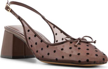 A delicate topline bow and charming polka dots adorn the mesh upper of a streamlined slingback pump set on a dual-density foam footbed and wrapped block heel.